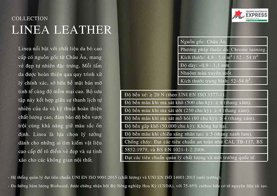 Dòng sản phẩm Linea được tạo nên từ da bò cao cấp có nguồn gốc từ Châu Âu, với các đặc điểm nổi bật sau: