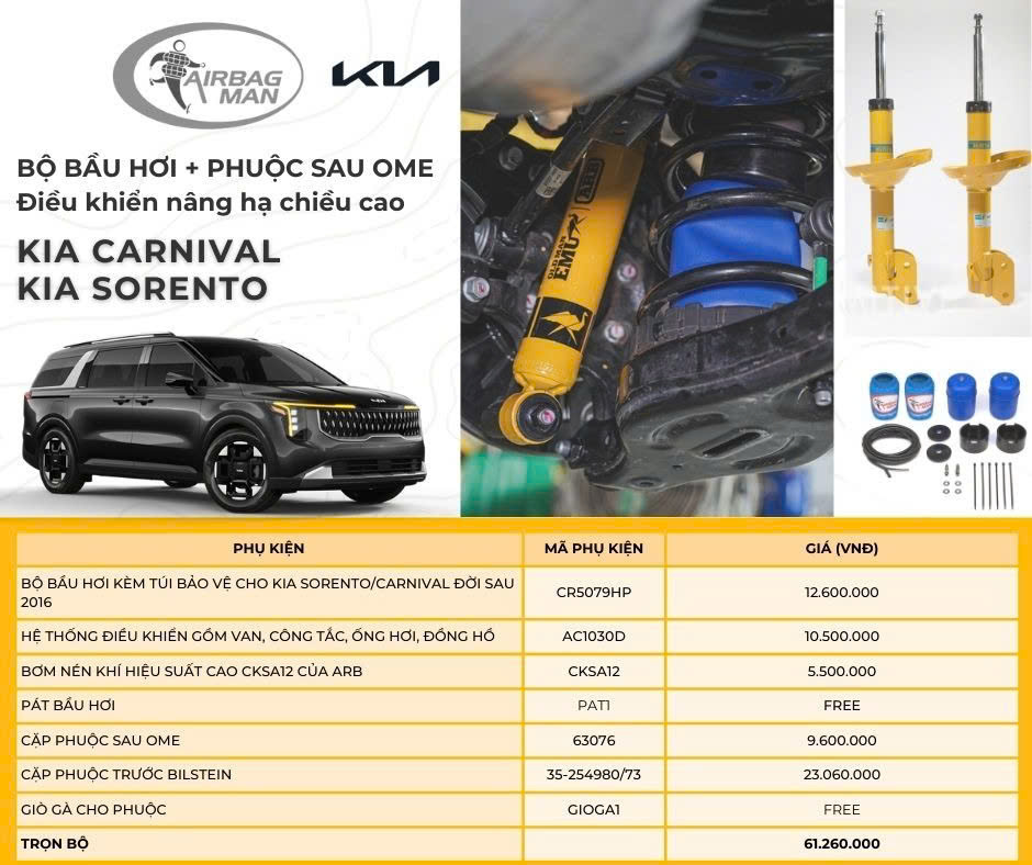 Giá: 9.800.000 VNĐ Bộ Bầu Hơi + Phuộc Sau OME - Phuộc Trước Bilstein dành cho Cho KIA Carnival & Sorento