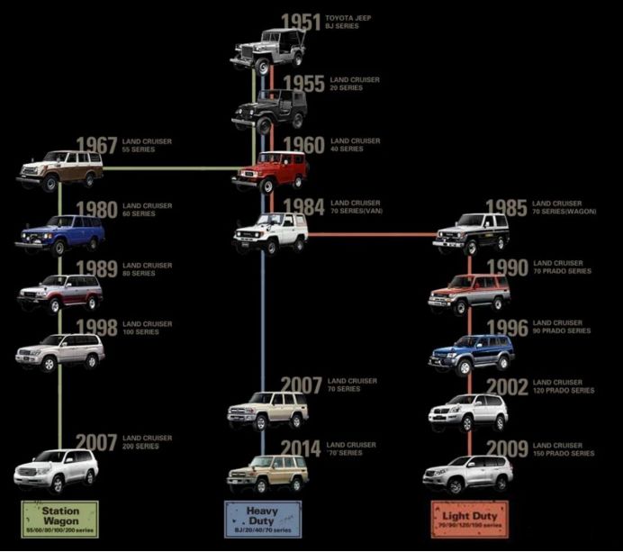 Toyota Land Cruiser bắt đầu sản xuất vào năm 1951, và tới nay đã ra 9 thế hệ xe. Trong 70 năm lịch sử, nó dần dần trở thành biểu tượng của tính năng off road và sự bền bỉ.