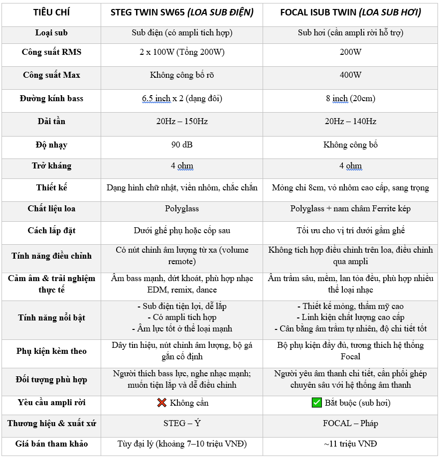 BẢNG SO SÁNH LOA SUB Ô TÔ: STEG TWIN SW65 VS FOCAL ISUB TWIN