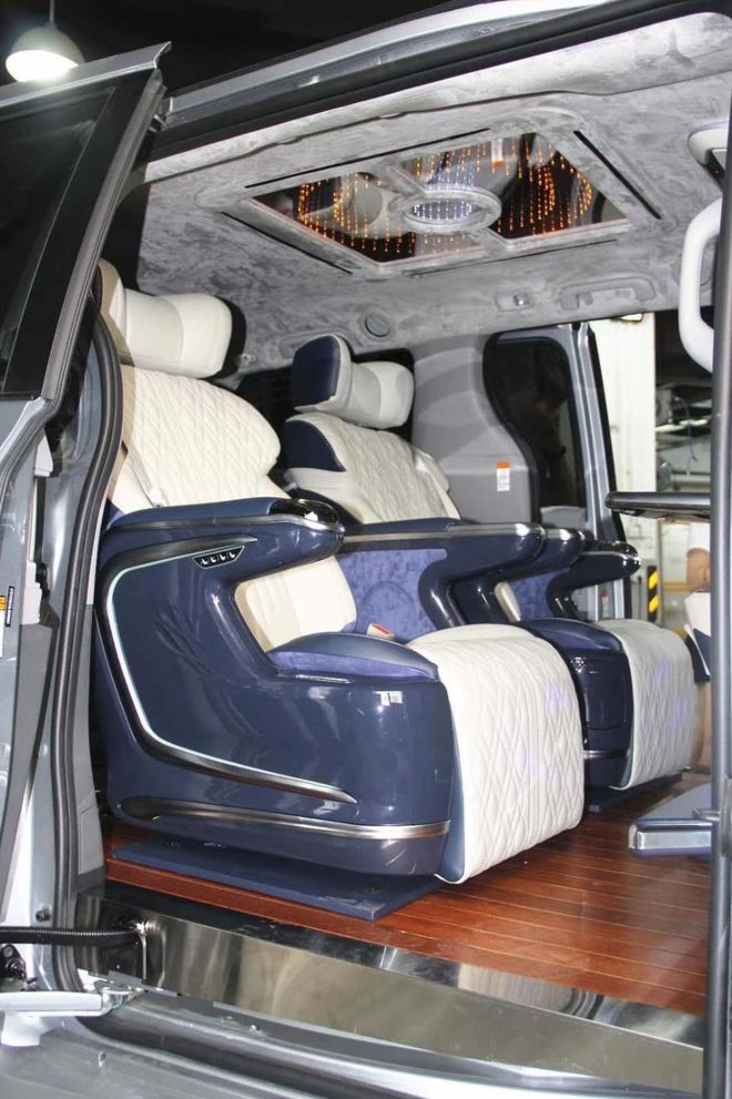 Ghế VIP Sienna Limousine được điều chỉnh thành bộ ghế mẫu mới, với tay ghế được đúc nhựa và sơn tĩnh điện , điều khiển bằng màn hình cảm ứng tất cả mọi chức năng trượt tới lui, ngả lưng, nâng chân, matxa, quạt thông gió.