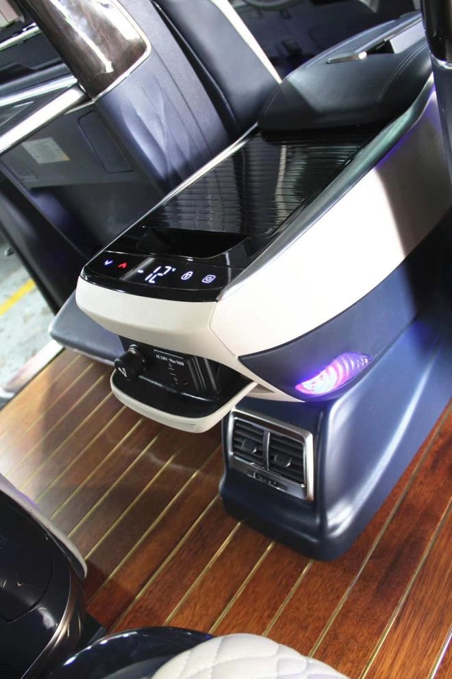 Lối đi rộng rãi ở hàng ghế giữa giúp khách hàng có thể lên xuống hàng thế thứ 3 dễ dàng. Phía trước, phần bệ tì tay được tích hợp tủ lạnh đa dụng, có thể vừa làm mát, vừa làm ấm, kèm các chỗ để ly tiện lợi, đèn LED được dùng để trang trí các phần điểm nhấn rất đẹp mắt. Bệ tì tay được điểm màu tối và viền gỗ, nên nhìn lúc nào cũng thấy sạch sẽ.