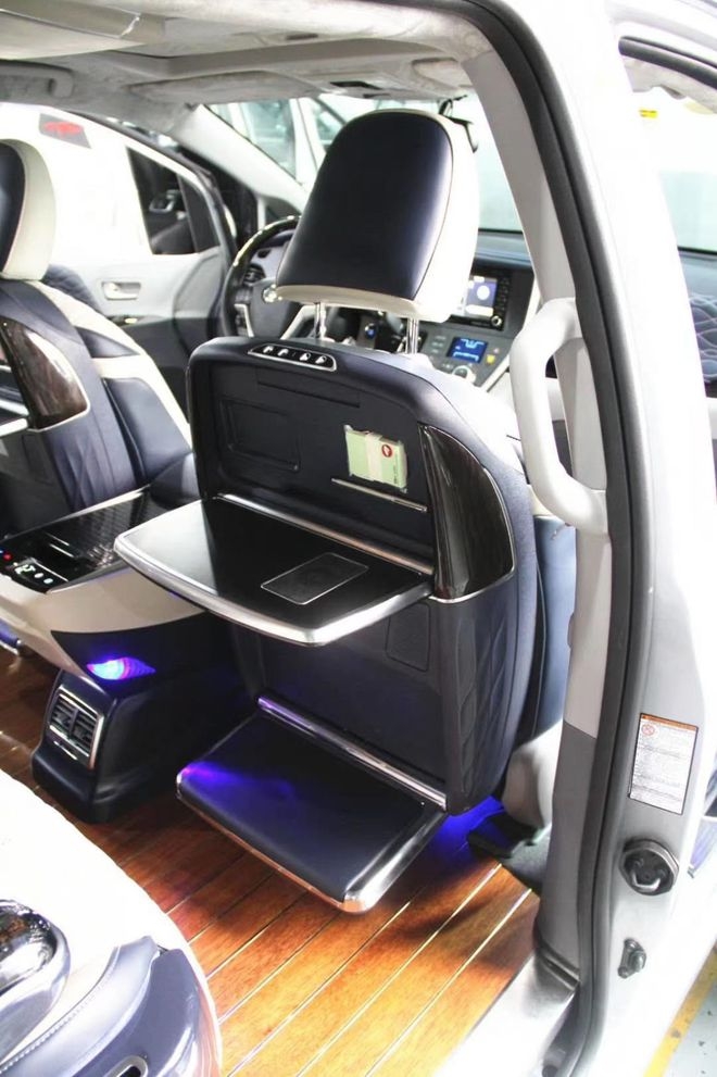 Hàng ghế sau, chúng tôi thay đổi thành mẫu ghế Sienna Limousine cao cấp, với đệm mút dày hơn và đàn hồi tốt hơn, tiện nghi cũng được nâng cấp nhiều hơn mẫu ghế nguyên bản. Nó có thể trượt tự động tới lui, ngả lưng lên xuống, và nâng đỡ chân lên xuống, phần gối đầu có thể chỉnh tự động lên xuống. Các options tiện nghi được thêm vào là matxa, thông gió cho ghế, sưởi nhiệt cho ghế, đầy đủ mọi tính năng cho một chiếc xe cao cấp. Bởi vì không gian xe rất rộng rãi nên các phần nâng cấp này hầu như ko ảnh hưởng nhiều tới không gian sử dụng. Cho dù là sử dụng cho gia đình, hay kinh doanh, thì chiếc xe này đều đáp ứng rất tốt các tiêu chí cho một chuyến du lịch hay đi công tác xa.