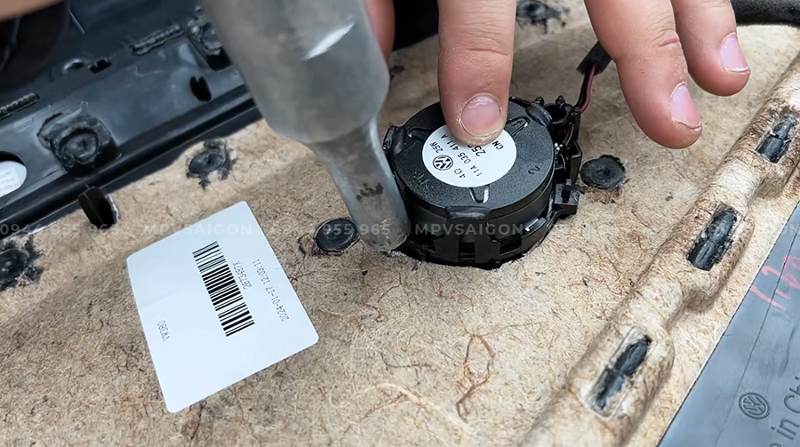 Da được cắt theo khuôn tapi nguyên bản, sau đó ép nhiệt để ôm sát từng đường cong. Các mép loa, tay nắm cửa, viền trang trí đều được căn chỉnh chính xác nhằm giữ lại thiết kế zin của Golf 8.